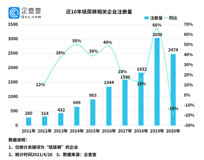 企查查多个方面数据显现,2011-2019年我国纸尿裤相关企业年注册量逐年攀升,2019年增加率和注册量均为历年来最高,全年新注册企业3036家,同比增加66%。2020年注册量为2474家,同比下降19%。