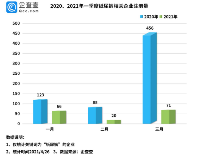 企查查多个方面数据显现,本年一季度共新增157家纸尿裤相关企业,同比下降76%。其间,1-3月份注册量别离为66家、20家和71家。