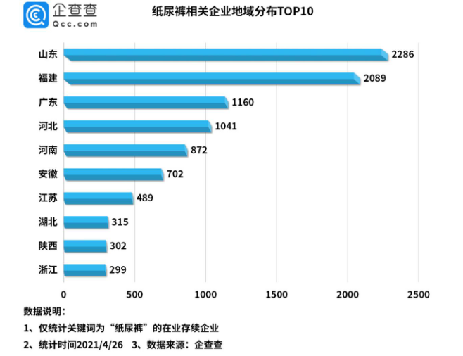 从区域散布来看,企查查多个方面数据显现,山东省的纸尿裤相关公司数最多,共有2286家,福建以2089家紧随其后,广东、河北、河南排列3-5位。